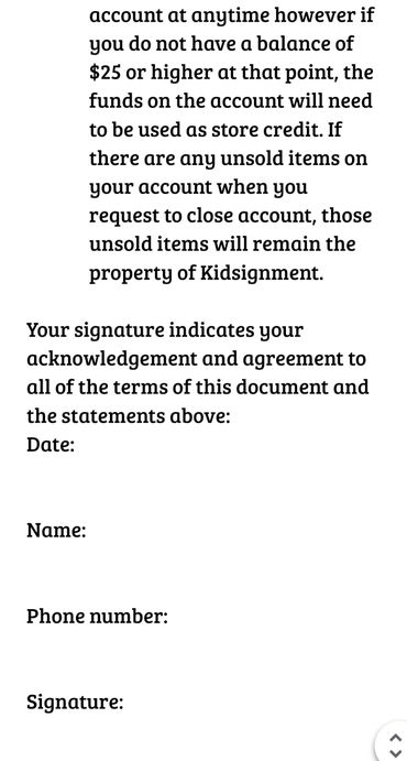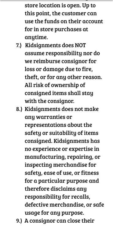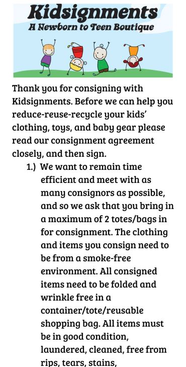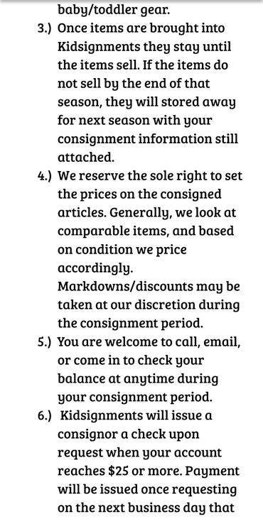Consignment items can be brought in anytime during normal business hours. Kidsignments will go through your items once dropped off. Once we have sorted your items, we will contact you to collect any items we can not take. You will need to pick up same day (unless specified other time) to pick up the items that could not be consigned or they will be donated. Once your item sells (for clothing shoes apparel etc you will receive 40% of the selling price for toys books baby gear etc it's 50%) will go into your account. When your account reaches $25 you can request payment or use it for in store purchase. All items brought in for consignment will stay in Kidsignments until it sells. In the completion of a season any of your items that do not sell will remain in store with your customer information to be returned to the sales floor the following season.